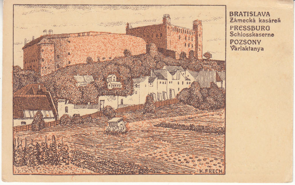 Karl Hugo Frech (1883–1945) war in der Zwischenkriegszeit der wohl produktivste Grafiker, Illustrator und Maler in Bratislava. Der grundlegende und besondere Beitrag seines Schaffens sind einzigartige Ansichten auf heute nicht mehr existierende Teile von Bratislava, Häuser, Straßen und romantische Winkel, die er auf seine ganz eigene Weise bewunderte. Die im diesjährigen Pressburger-Kalender veröffentlichten Illustrationen sind Teil einer 12-teiligen nummerierten Postkartenserie "Künstlerische Blätter", die Karl Angermeyer Anfang der 1920er Jahre herausgab.