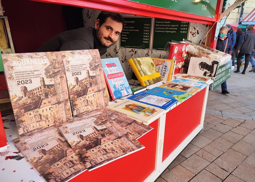In unserem Weihnachtsmarkt-Stand auf dem Hauptplatz von Bratislava können Sie auch unseren beliebten Pressburger Kalender 2023 kaufen!