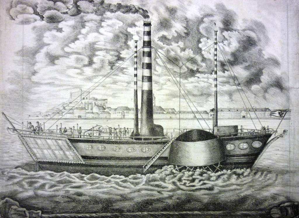 Der Dampfer Carolina, der auf der Route Wien – Budapest durch Pressburg fuhr. Zum ersten Mal legte er die Strecke zwischen Wien und Pressburg am 4. September 1830 zurück. Die Fahrt dauerte insgesamt drei Stunden. (Quelle: Archiv des Bürgervereins Pressburger Kipferl)