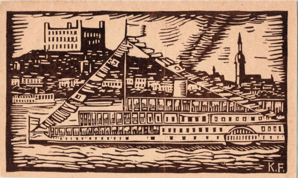 Eine Postkarte mit dem Motiv eines Dampfschiffes auf der Donau des berühmten Malers und Grafikers Karl Frech 1883 -1945). (Quelle: Archiv des Autors)