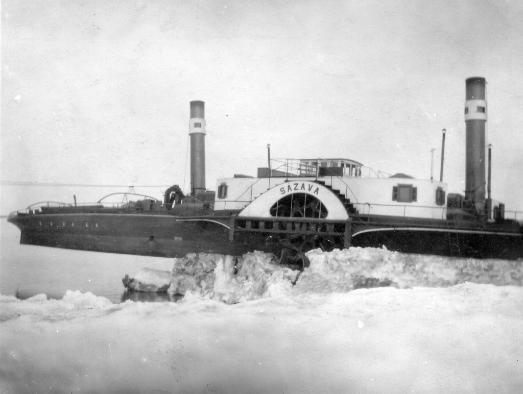 Der Dampfer Sázava, der im Winter 1927 in einem eisigen Griff feststeckte. Das Schiff konnte schließlich doch befreit werden und wurde ohne Schäden in den Hafen von Bratislava transportiert. (Quelle: Archiv von Juraj Bohunský)