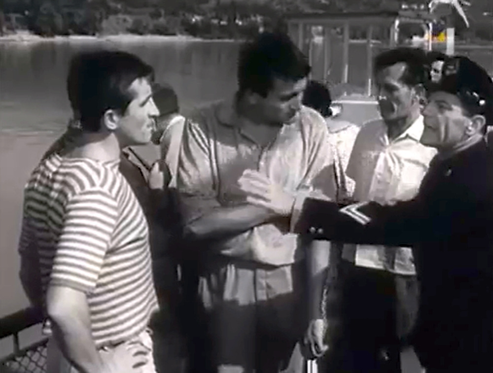 Milan Lasica (in der Mitte) und Július Satinský (links) an Bord des Schiffes Bratislava im Film „Ausflug auf der Donau). Satinský wirkt in seinem Matrosen-T-Shirt sehr überzeugend, er sieht aus, als wäre er in seinem Element, schließlich hat er sein ganzes Leben lang in einer Straße in Bratislava gewohnt, die nach der Donau benannt wurde. (Reprofoto: Autor)