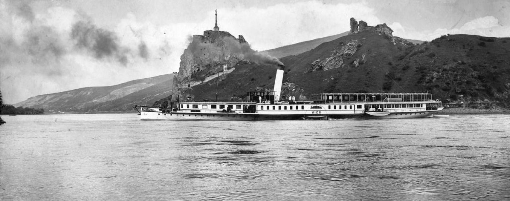 Nostalgische Zeiten, als Dampfschiffe über die Donau herrschten. Jahr 1919: Ein Schiff namens Wien unter Theben, auf dem damals noch das Millenniumsdenkmal stand. (Quelle: Fortepan)