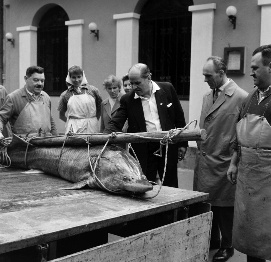 Das Foto zeigt einen 105 Kilogramm schweren und 215 Zentimeter langen Hausen, der 1962 von ungarischen Fischern aus der Donau gefangen wurde. (Quelle: Fortepan)