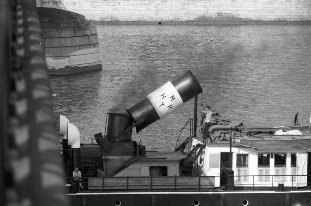 1961: Dampfschiff auf der Donau mit heruntergeklapptem Schornstein, von Széchenyis Kettenbrücke aus gesehen. (Quelle: Fortepan)