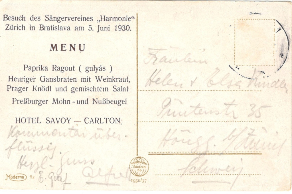 Postkarte vom Hotel SAVOY - CARLTON zum Anlass vom Besuch des Sängervereins "Harmonie" Zürich mit Menü. Quelle: Peter Janoviček