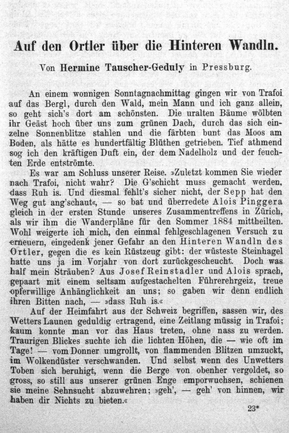 Hermines Artikel über die Besteigung des Ortlers, veröffentlicht 1885 in der "Zeitschrift des deutschen und österreichischen Alpenvereins" (Quelle: www.anno.onb.ac.at)