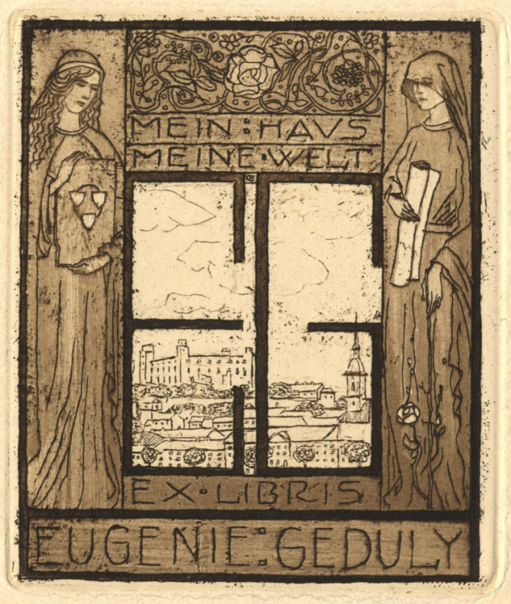 Exlibris mit einem Motiv aus Bratislava von Eugenie Geduly, geschaffen vom tschechischen Maler und Grafiker Emil Orlík. (Quelle: www.collections.imm.hu)