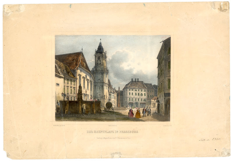 Der Hauptplatz bietet einen recht bunten stilistischen Mix, im Ergebnis trotzdem ein recht harmonisches Bild. Es wär mir und wahrscheinlich auch Ihnen fad, Gebäude für Gebäude aus kunsthistorischer Sicht zu besprechen. Ich mag das Palais Kutscherfeld (in Rokoko, am Eck zur Sattlergasse), jetzt französische Botschaft, wo Rubinstein vielleicht seine Melodie in F komponierte. Schräg gegenüber steht das Palais Palugyay, in den 1880er Jahren von Viktor Rumpelmayer gebaut, mit einem bei Touristen recht beliebten Café und einem Geschirrgeschäft am Eck zur Grünstüblgasse (Zelená). Ob der Viktor Rumpelmayer mit dem Anton Rumpelmayer, Lieblingskonditor von Kaiserin Elisabeth und erfolgreicher Unternehmer an der Côte d’Azur, in Paris und Baden-Baden, verwandt war? Jedenfalls stammte Anton auch aus Pressburg.