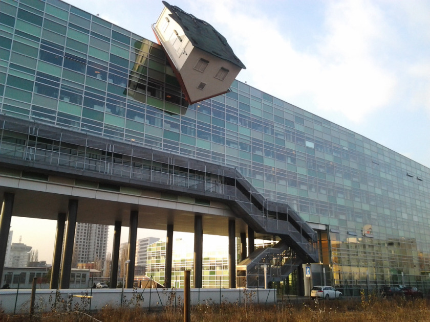 Tu však je situácia hneď iná: dom je v bezprostrednom kontakte so svojim okolím (pevnejšie by ani nemohol byť prilepený na svojho partnera). Žije s budovou vo svojráznej symbióze, ako v prípade hrocha s volavkou, vyzdvihuje materiálnosť zrkadlovo hladkých monotónnych a sterilných stien, pritom vyzerá tak, ako keby sa mohol každú chvíli zrútiť. Pravda, k veci patrí aj to, že umiestnenie celého zmätku bolo pôvodne naplánované inde: domček v roku 2009 bol viditeľný na budove MUMOK vo Viedni. Tam sa mu dostalo asi väčšej úlohy, budove pripomínajúcej bunker, z hrubých bazaltových tehál antracitovej farby, ktorá vyzerá ako kameň (modernej doby) v Kaabe (je to skvost stavebnej kancelárie Ortner&Ortner). Tam teda bolo v hre aj to, že tvorca diela sa dotýka svojim sarkastickým spôsobom inštitucionálneho rámca vysokého umenia, respektíve aj možnosti vstupu do futuristických palácov súčasného umenia