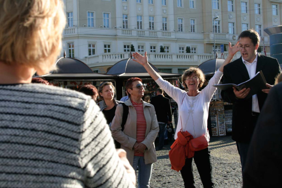 Dynamická (a rafinovane zosnovaná) kompozícia, miestami dopĺňaná vyslovene teatrálnymi, občas dokonca interaktívnymi prvkami, nás previedla historickým centrom mesta prostredníctvom diel takých slávnych osobností ako Mihály Vörösmarty, Sándor Petőfi, Gyula Reviczky, Rezső Szalatnai či Ferenc Keszeli. A po príchode na Michalskú ulicu nás Árpád zasvätil aj do bratislavských osudov fiktívneho básnika Sándora Tsúszóa (a do okolností jeho legendárneho, priam mystického zmiznutia).