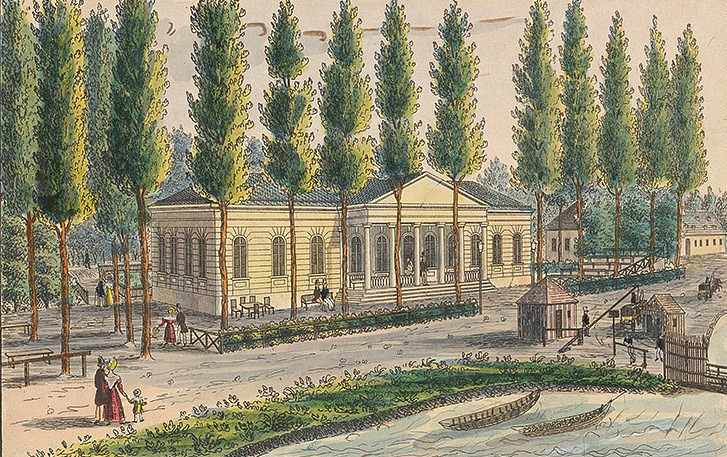 Bývalá kaviareň Sad (Au Café) okolo roku 1850 na grafike Johanna Vincenza Reima