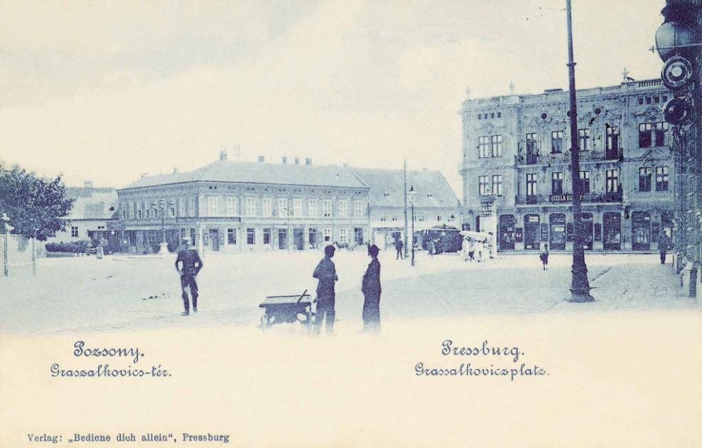 Križovatka Hodžovho námestia a Suchého mýta začiatkom 20. storočia. Druhý sprava je dom s č. 28, ktorý vlastnili Bäumlerovci. Zdroj: Archív Júliusa Cmoreja