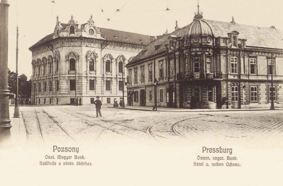Pomenovanie dostávali podľa svojich vývesných štítov, ktoré sa vyvinuli z pôvodných domových znamení. Medzi nimi vynikal hostinec U červeného vola (Gasthaus zum roten Ochsen), a to nielen svojím netradičným názvom. Za ten podľa ústneho podania vďačil istému chudobnému krajinárovi z 18. storočia, ktorý po viacdňovej návšteve nemal čím uhradiť pobyt v tomto zariadení. Napokon svoj dlh po dohode s majiteľom splatil tým, že na vývesný štít nad bránou namaľoval ktovie prečo červeného vola... Kedy presne hostinec postavili, sa zatiaľ nepodarilo doložiť. Isté je, že začiatkom 19. storočia sa už dlhšie vynímal na nároží dnešnej Štúrovej a Jesenského ulice. Historické fotografie však zachytávajú až jeho podobu zo 70. rokov 19. storočia, kedy bol kompletne prestavaný. Vstup pre hostí mal z Jesenského ulice, pohodlný vjazd pre vozy zozadu, zo súbežnej Medenej ulice. Keďže pred hostincom bolo stanovište poštového dostavníka, premávajúceho medzi Prešporkom a Hainburgom, núdzou o návštevníkov skutočne netrpel. A veru by sa medzi nimi našlo aj viacero prominentov.