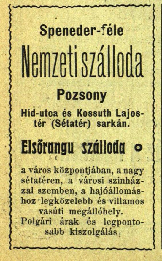 Spenderov Národný hotel na rohu Mostovej ulice a Kossuthovho námestia.