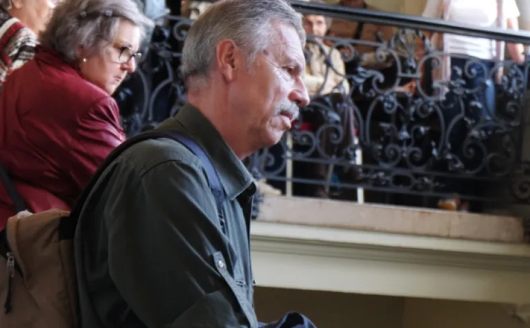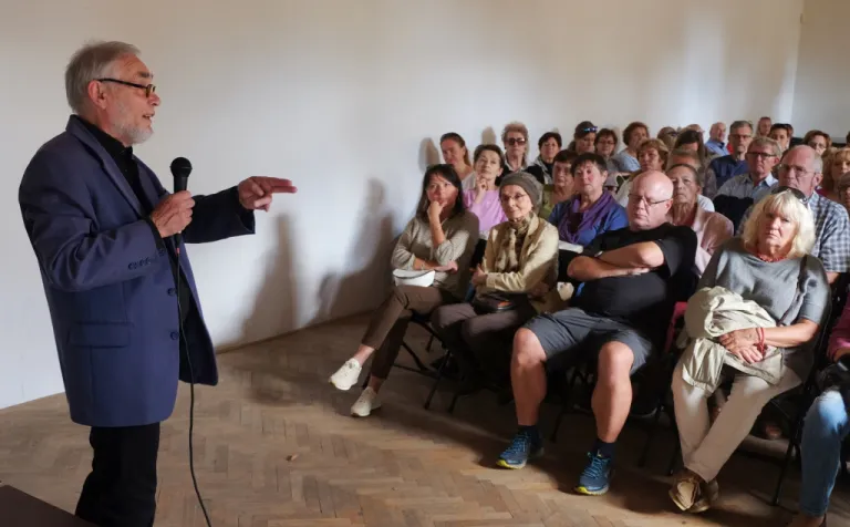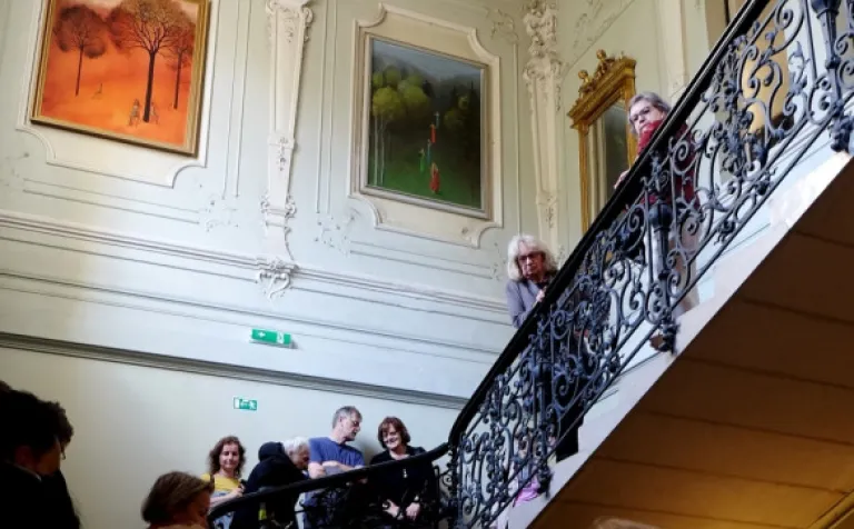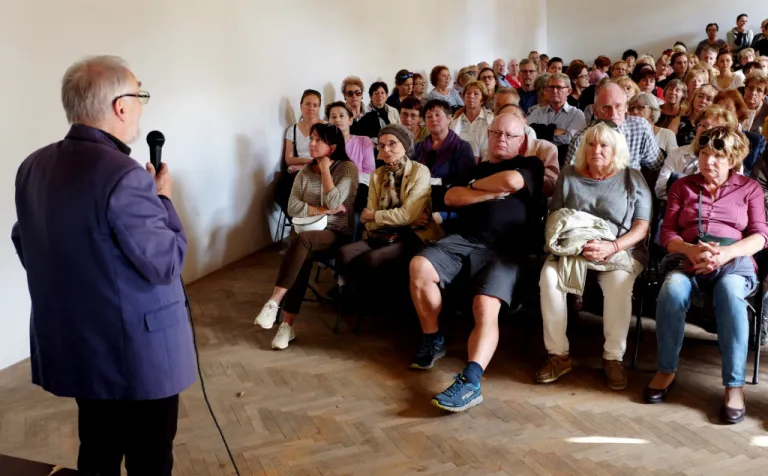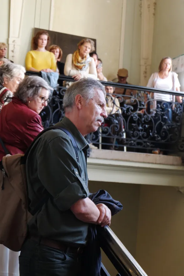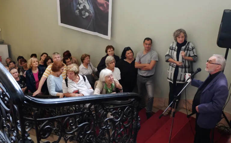 Toto veľké množstvo ľudí neprilákal palác samotný, ale zaujímavá prednáška dr. Štefana Holčíka, ktorý nám s nadšením jemu vlastným porozprával o lekárnikovi Felixovi Pisztorym, jeho manželke Ide a najmä o histórii paláca. Previedol nás výstavnými priestormi tejto nádhernej eklektickej budovy. Dozvedeli sme sa mnoho zaujímavých informácií nielen o výjavoch na freskách a štukovej výzdobe, ktoré boli mnoho rokov ukryté pred zrakmi návštevníkov.
