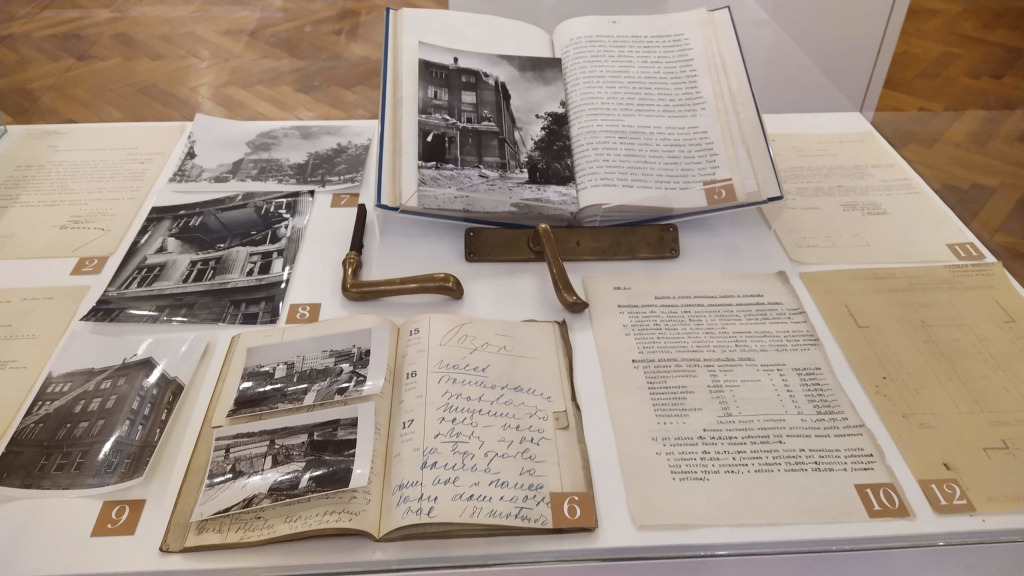 Vedľa modelov a plánov jeho najdôležitejších stavieb nájdeme vitríny so zaujímavými písomnosťami a fotografiami, napr. o stave múzejnej budovy poškodenej 16. júna 1944 pri bombardovaní Apolky, spolu s denníkom architekta otvorenom na inkriminovanom týždni. Rekonštrukčné práce múzea prebiehali až do r. 1951 pod Harmincovým stavebným dozorom. Ďalším nevšedným exponátom je list Heleny Prügerovej, vdovy po Henrym Prügerovi, manželom Harmincovcom – blahoželanie k sobášu ich dcéry Oľgy – na hlavičkovom papieri Hotela Carlton-Savoy. Harminc bol autorom prestavby hotela v rokoch 1925-1928.