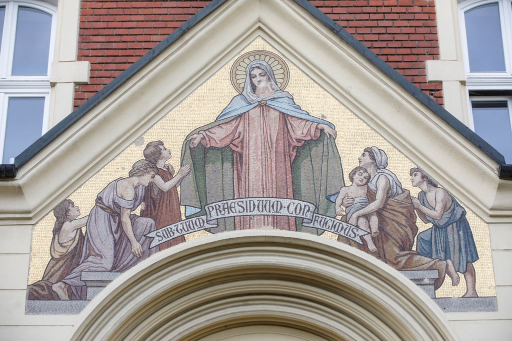 Na sakrálny charakter budovy odkazovala mozaika nad hlavným vchodom, ktorá vznikla podľa predlohy jedného z najvýznamnejších dobových maliarov Károlya Lotza. Narodil sa v roku 1833 v Bad Homburgu maďarskej matke a nemeckému otcovi, ale tvorivé roky prežil v Budapešti a bol jedným z najvyhľadávanejších maliarov fresiek poslednej tretiny 19. storočia. Jeho nástenné maľby zdobia Maďarské národné múzeum, budapeštiansku Redutu, Maďarskú akadémiu vied, Maďarskú štátnu operu, Baziliku sv. Štefana aj Parlament. „Jeho nástenné maľby, olejomaľby, akvarely a štúdie nemajú konca a kraja,“ píše Lotzov monografista Ervin Ybl. Pre Prešporok to mohla byť veľká česť, že sa nad vstupný portál sirotinca dostala mozaika Panny Márie Ochrankyne, vytvorená podľa predlohy takého významného majstra.