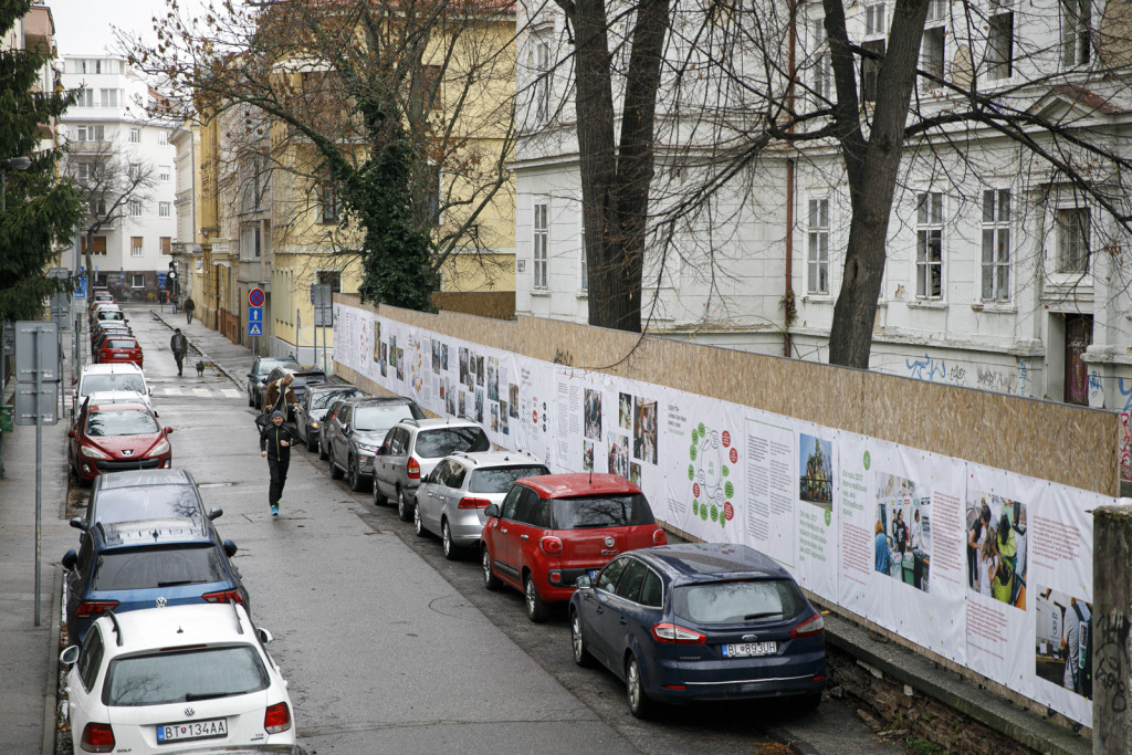 Exteriérovú výstavu sa zvyčajne každý snaží navštíviť počas dňa – najmä v zime, keď sa už o pol piatej popoludní stmieva. Táto výstava má však jednu veľkú výhodu: je na nej čo objavovať za svetla i za tmy. Určite sa oplatí zastať aj na rohu Panenskej a Štetinovej ulice, lebo na požiarnom múre dvoch domov „bežia“ filmové zábery z desiatich ročníkov Dobrého trhu, ktorého neoddeliteľnou súčasťou bol aj stánok s publikáciami OZ Bratislavské rožky.