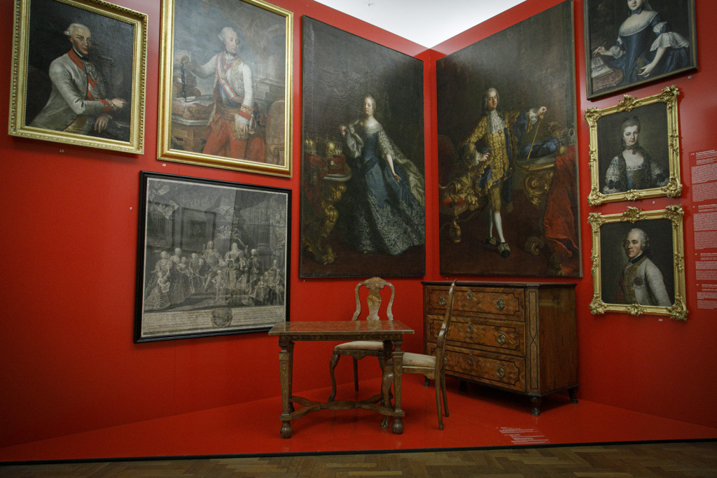 Do prezentovaného obdobia nás vtiahnu červené panely odkrývajúce výklenky s veľkorozmernými portrétmi Habsburgovcov aj Pálffyovcov od popredných dobových portrétnych majstrov a z ich dielní (Johann Gottfried Auerbach, Rosalba Carriera, Johann Gottfried Haid, Martin van Meytens, Jacob Schmutzer). Nájdeme tu aj jeden z portrétov chovankýň bratislavského kláštora Notre Dame, tzv. „modrých dám“, a to portrét Šarloty (Charlotty, Karolíny) Pálffyovej od Daniela Schmiddeliho a tri portréty dôstojníkov husárskeho pluku Rudolfa Pálffyho.