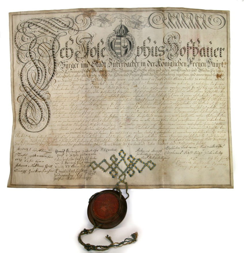 Výučný list vydaný mestským cukrárom Jozefom Hofbauerom – je príkladom prameňa jednotliviny, ktorý nesie v sebe vysokú výpovednú hodnotu. Pre koniec 18. storočia identifikuje v meste štyroch mestských cukrárov a piatich cukrárov miestnej honorácie.