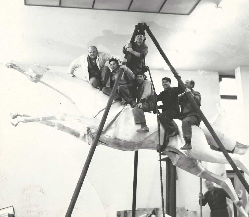 Fotografia z práce na soche Slncový kôň (Ateliér na Piešťanskej ulici, 60.-te roky). Z archívu sochára Alexandra Trizuljaka. Zdroj: Alexander Trizuljak - Sochár - Sculptor
