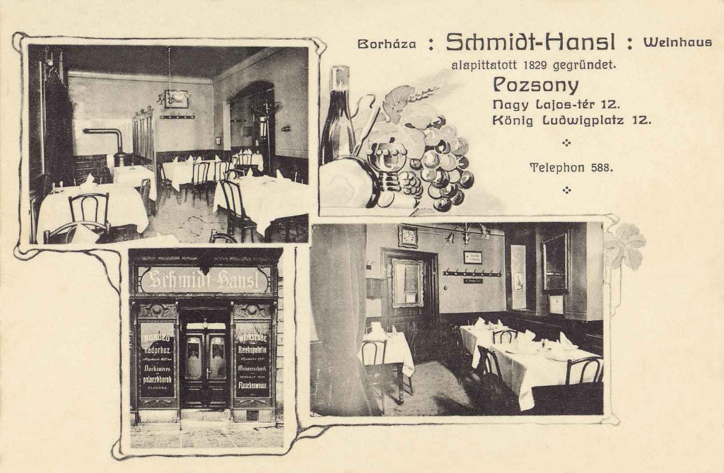 Reklamná pohľadnica vinárne Schmidt-Hansl okolo roku 1915. Zdroj: J. Cmorej