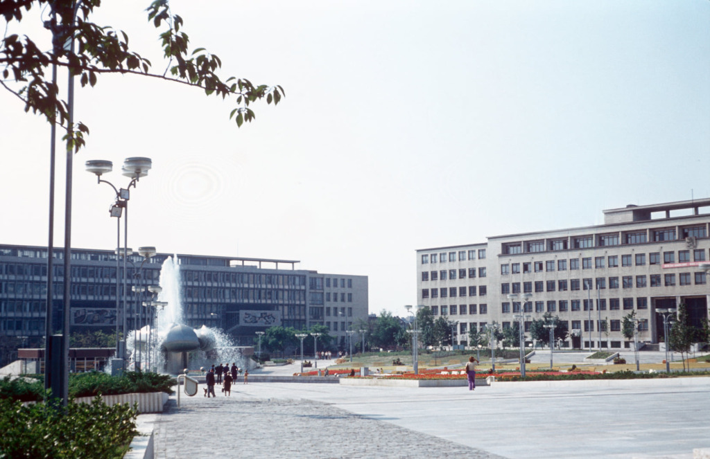 Nová, hypermoderná Bratislava v 80-tych rokoch: prestavané Námestie slobody s fontánou a kvetmi; v pozadí budova Strojníckej fakulty Slovenskej technickej univerzity (STU).