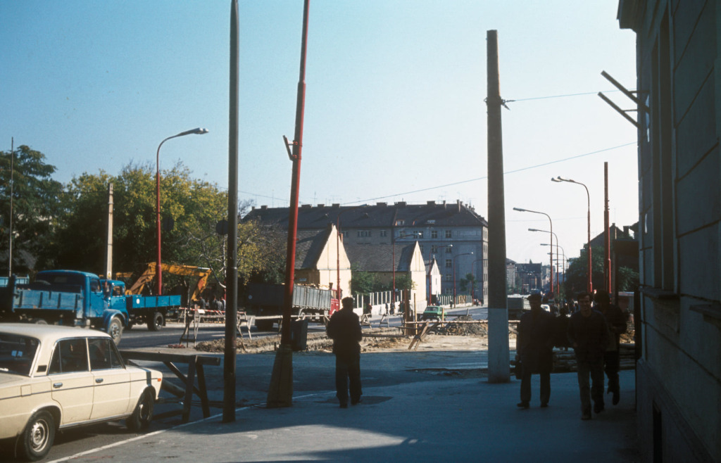 Opäť Karadžičova ulica s „malou stanicou“. Všimnime si, že osobné autá v pravom jazdnom pruhu sú samé škodovky.