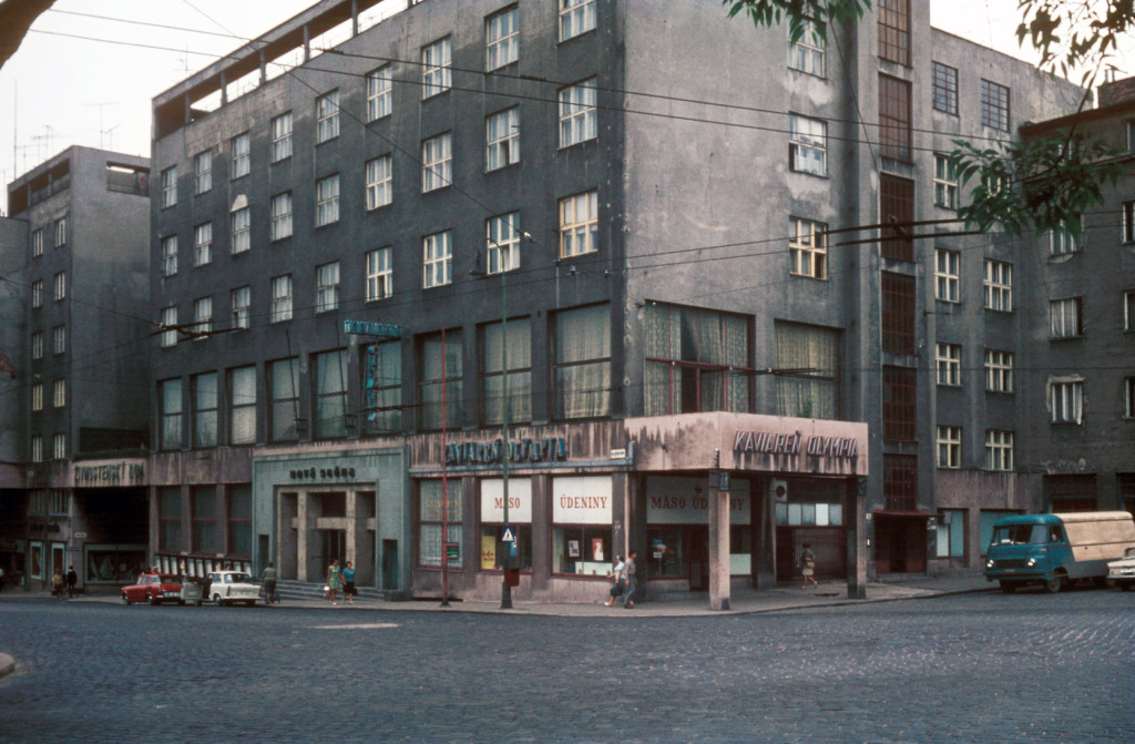 Mačacie hlavy už nenájdeme ani tu. Živnostenský dom s novým javiskom a s kaviarňou Olympia. Z výkladu mäsiarstva sleduje pouličný ruch biela kačka namaľovaná na červenom pozadí. Dvere trabanta, parkujúceho pred vchodom do divadla, zabudli zatvoriť.