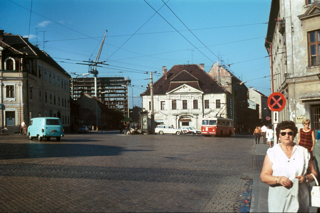 Túto kaviareň miestni vtipne nazývali aj Böži, lebo ju istý čas navštevovali tí, čo sa chceli zoznamovať. Vychádzal sem trolejbus, ktorý na predchádzajúcej fotografii zamieril na Mickiewiczovu ulicu, zatiaľ čo ulica, do ktorej vľavo odbočuje Škoda 1203, odvtedy zanikla. V pozadí ešte stoja staré budovy ohraničujúce Kollárovo námestie a Radlinského ulicu, z ktorých sa dodnes nezachovala ani jedna – s výnimkou práve rozostavanej STU v pozadí. Krátke rukávy a slnečné okuliare napovedajú, že fotka vznikla v lete.