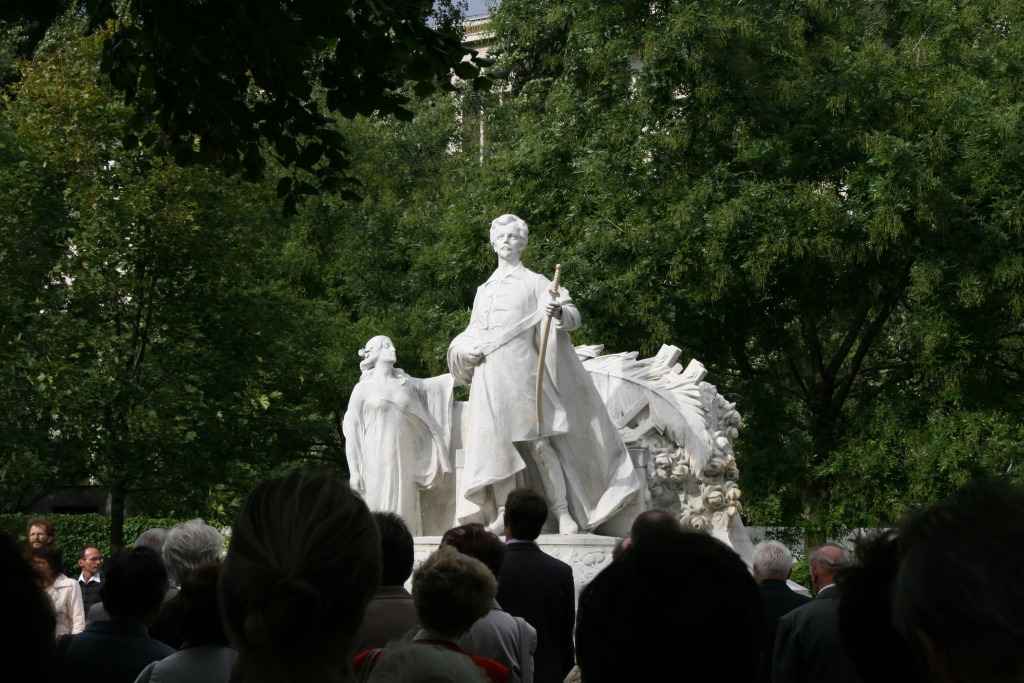 Bratislavský kult Sándora Petőfiho: socha Sándora Petőfiho sa dnes nachádza v Medickej záhrade, kde sa každoročne konajú spomienkové podujatiapri príležitosti osláv 15. marca (fotografia vznikla na jednom z týchto podujatí). Kult hral vždy dôležitú rolu pri upevňovaní identity bratislavských Maďarov. Foto: Jenő Görföl
