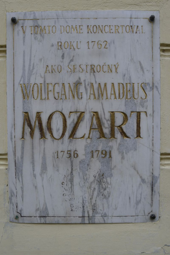Pamätá tabuľa na Pálffyho paláci v Bratislave. O tom, že by W. A. Mozart koncertoval práve v tomto paláci, však chýbajú dôkazy. (Autor: Robert Hofrichter)