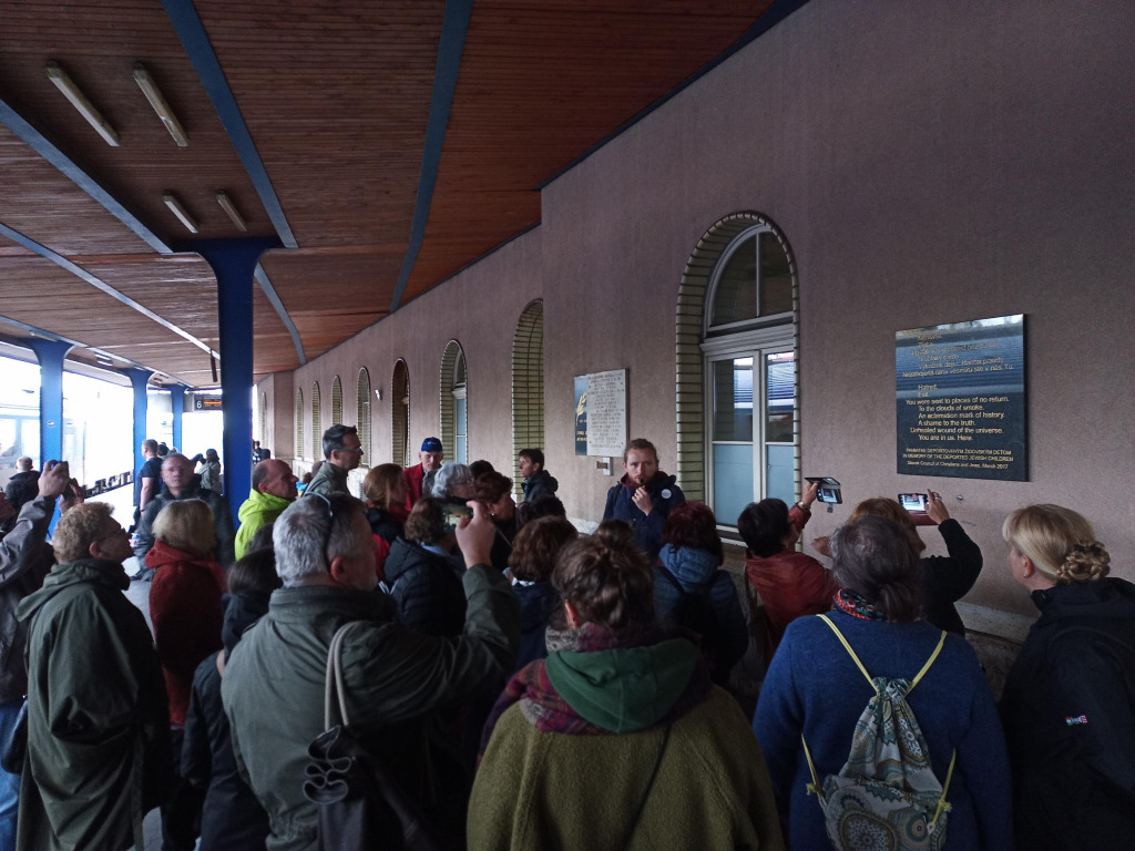 Vyše šesťdesiat záujemcov sa na prechádzku vydalo z námestia, kde kedysi stála neologická synagóga a dnes sa tu nachádza pamätník holokaustu. V priebehu prednášky, ktorá sa dotkla aj mnohých čiastkových tém, sa účastníci dozvedeli viac napr. o osude kníhkupeckej rodiny Steinerovcov, o protižidovských zákonoch Slovenského štátu či o vzťahu prezidenta Jozefa Tisa k Židom. Poslednou zastávkou bola pamätná tabuľa, ktorá je osadená v budove Hlavnej stanice a pripomína deportáciu židovského obyvateľstva do táborov smrti.