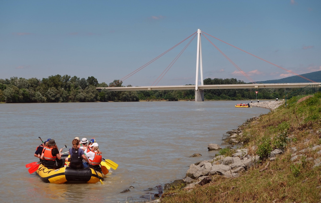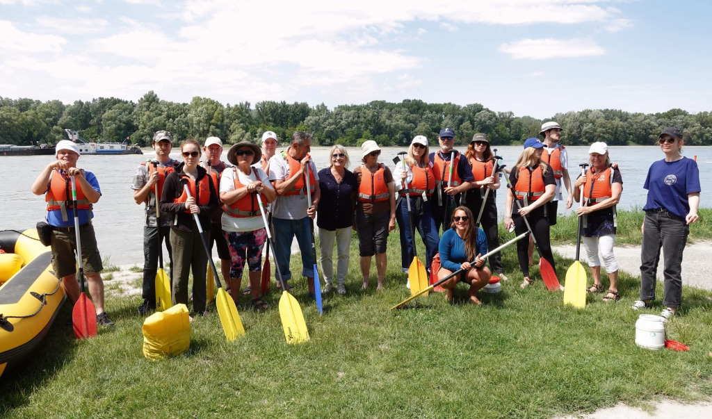 Účastníci splavu Dunaja po hranici Rímskej ríše Danube Limes. Splav štartoval v kúpeľnom mestečku Bad Deutsch Altenburg a končil v Karloveskej zátoke.