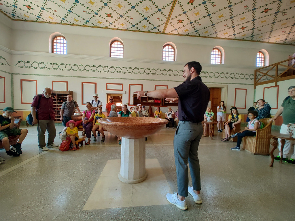 Miestny sprievodca so skupinou v budove rímskych kúpeľov.