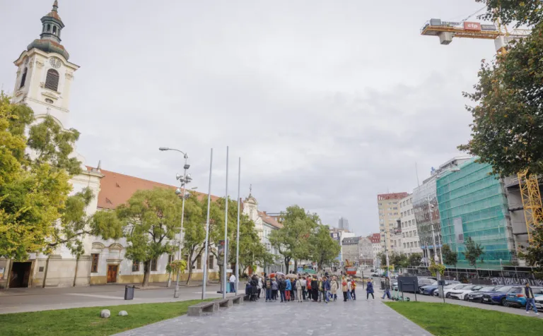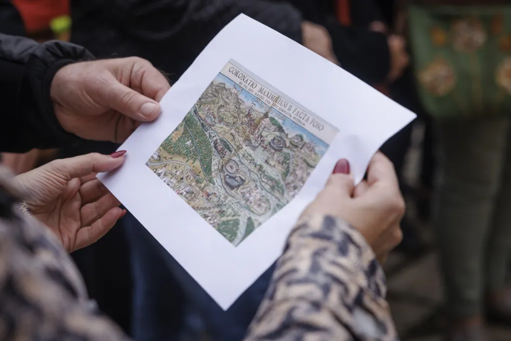 Následne sme absolvovali trasu pôvodného korunovačného sprievodu cez Kapitulskú, Ventúrsku a Sedlársku ulicu na Hlavné námestie, kde sme si pozreli fontánu zachytávajúcu kráľa Maximiliána I., prvého panovníka korunovaného v Prešporku. Prechádzku sme ukončili pred Kostolom Milosrdných bratov, kde sme si pripomenuli aj poslednú zastávku tohto historického obradu – niekdajší korunovačný pahorok, ktorý sa nachádzal pri Dunaji.