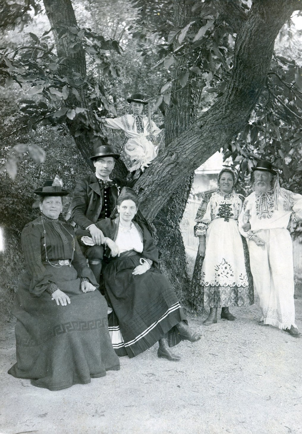 „Kostüm-Fest“ in Pressburg, um 1900. Die jungen Schillings trugen die Tracht von Bad Deutsch Altenburg, während Julius Schilling (der alte Mann mit dem weißen Bart, Besitzer der Villa) und seine Frau in siebenbürgischer Tracht gekleidet waren.