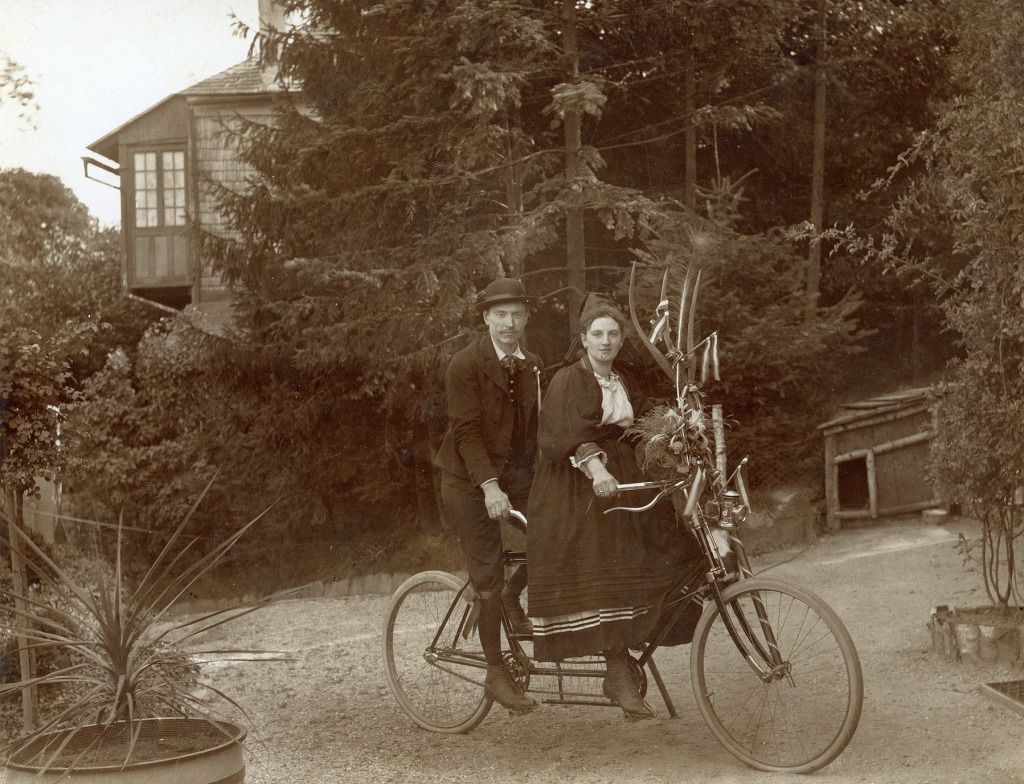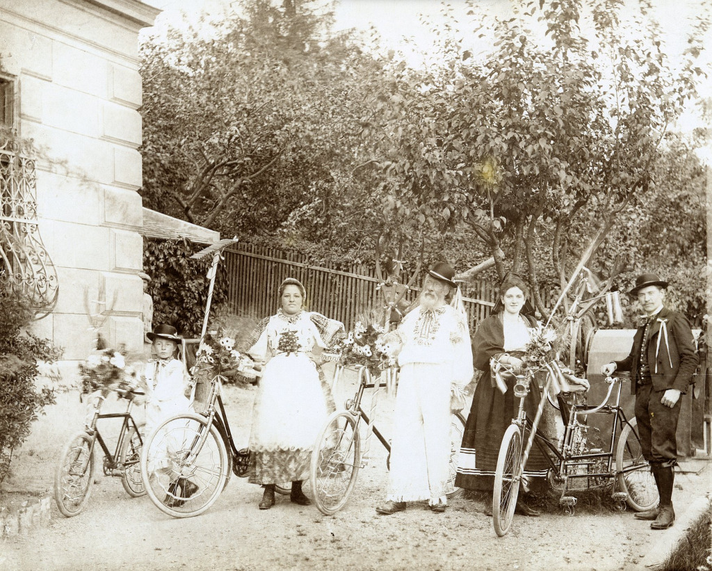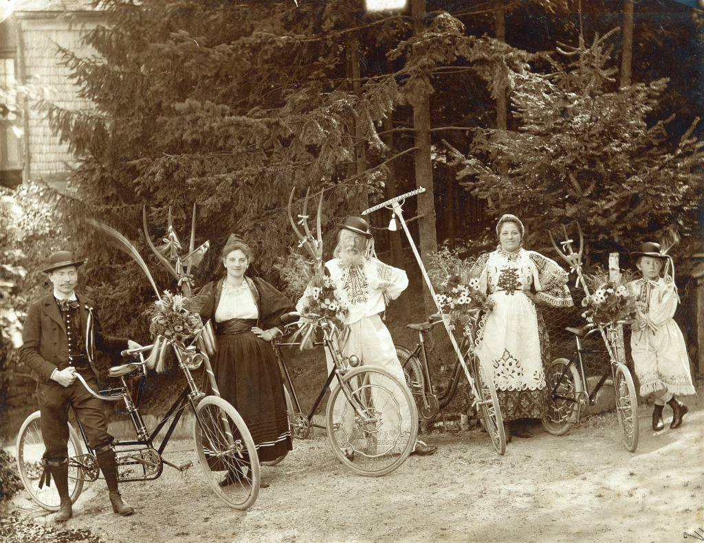 Eine seltene Kombination von modernen Fahrrädern und Volkstrachten.