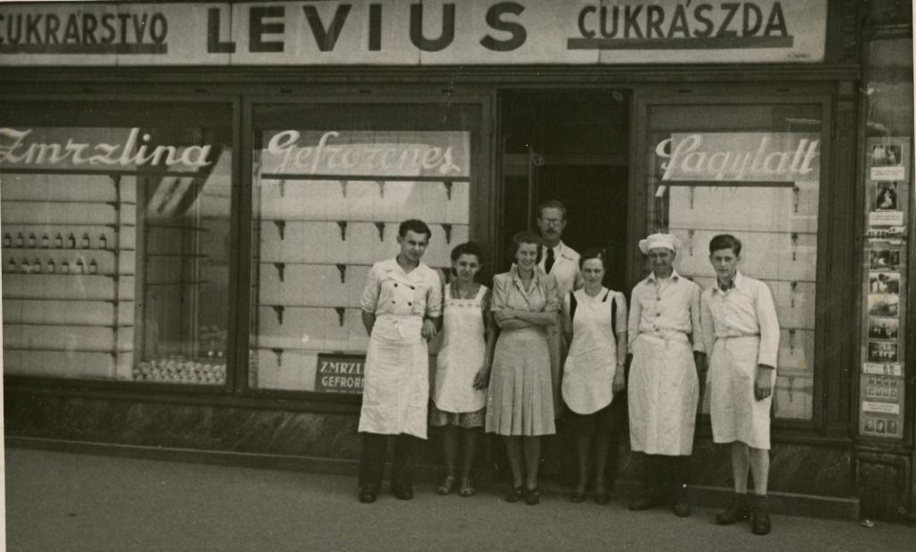Mein Vater steht im Hintergrund, die Frau vor ihm ist meine Mutter. Neben ihr stehen Serviererinnen, ich erinnere mich an die links stehende Frau, sie hieß Lujza. Damals wurden Kellnerinnen „Fräulein“ genannt. Der Mann mit der Mütze war der Konditormeister Jozef Javorčík aus dem Stadtteil Prievoz (Oberufer), die beiden anderen jungen Männer waren Lehrlinge. Die Konditorei Levius hatte einen Namen auf Slowakisch, Ungarisch und Deutsch und in ihren Schaufenstern ist u.a. „zmrzlina“, „Gefrorenes“ sowie „fagylalt“ zu lesen. Als unser Großvater Viliam bei der Volkszählung von 1930 nach seiner Nationalität gefragt wurde, gab er keine an. Er sagte: „Ich bin ein Pressburger.“