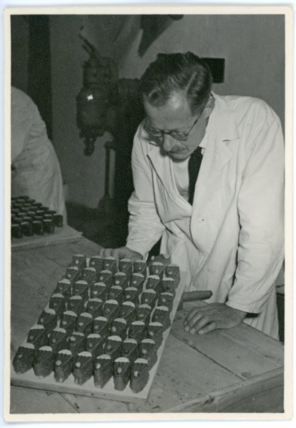 In Ihrem Familienarchiv gibt es ein sehr interessantes Foto, auf dem Ihr Vater zu sehen ist, wie er sich über eine Platte mit seltsamen Schokoladenfiguren beugt.