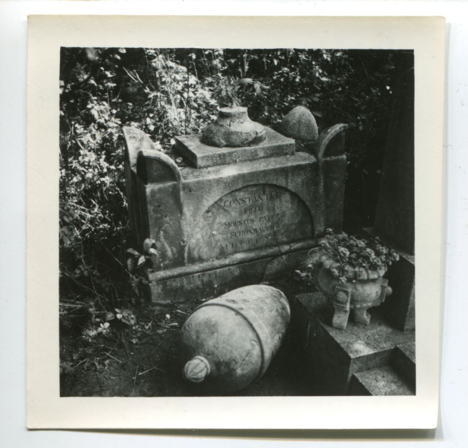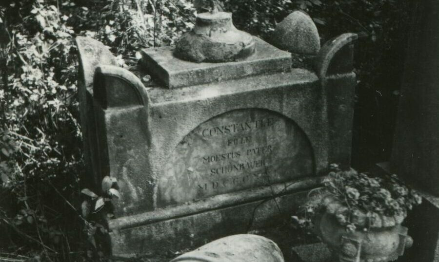 Nach den Zeitfotos ist aber festzustellen, dass den Grabstein seiner Tochter eine dekorative Artischocke geschmückt hat, unter dieser stand die Anschrift CONSTANTINAE FILIAE MOESTUS PATER SCHÖNBAUER MDCCCXXI. Übersetzt: trauernder Vater Schönbauer der Tochter Konstantia, 1821. Wenn nach 39 Jahren nach der Tochter auch der Vater beigesetzt wurde, standen beide Grabsteine jahrzehntelang nebeneinander. Für die Friedhofsbesucher, die die Anschrift verstanden haben, stellte diese nur noch Trauer und unbekannten Schicksal dar.